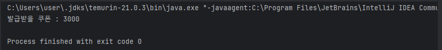 여기서 coupon = 3000; 을 수행하고 break 문을 만나 switch 문을 빠져나간다. - "발급받은 쿠폰 3000" 이 출력된다.