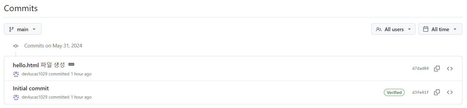 commits를 누르면 히스토리 확인이 가능하다.