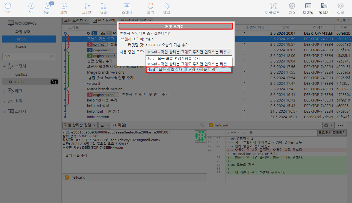 main을 돌아가고 싶으면 돌아갈 지점 선택 > 해당 커밋까지 브랜치 초기화 > Hard 선택 후 진행