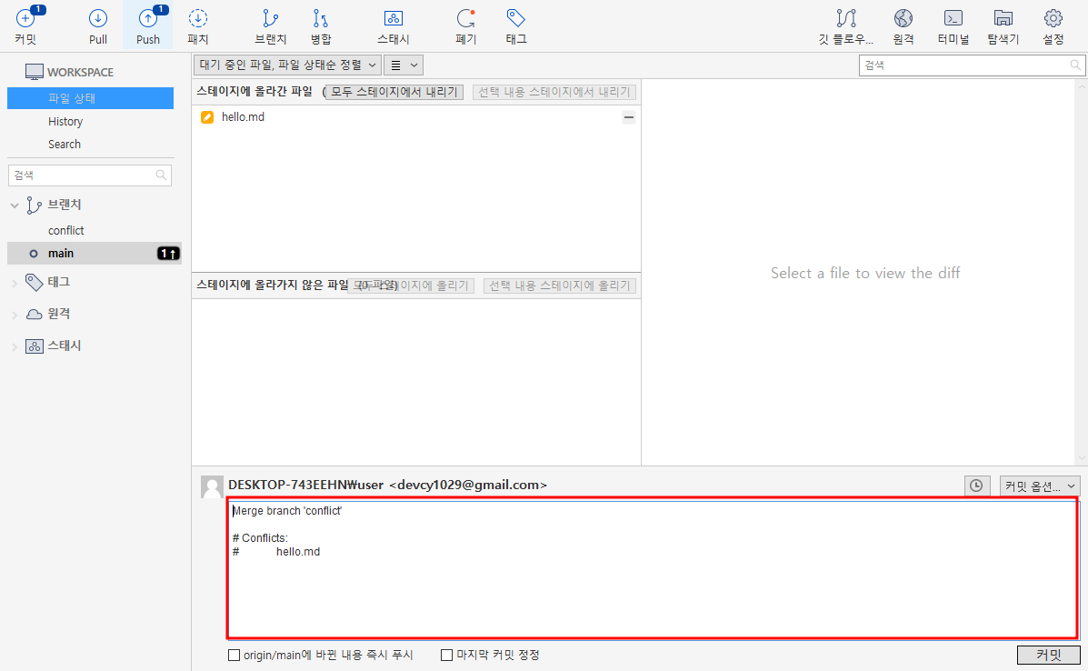 재 커밋 시 충돌했던 파일 목록 들을 확인할 수 있다.