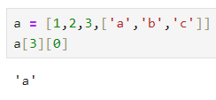 ** a[3]은 ['a', 'b', 'c'] 리스트를 가르키며 [0]을 통해 해당 리스트의 첫 번째 요소값을 불러 올 수 있다.
