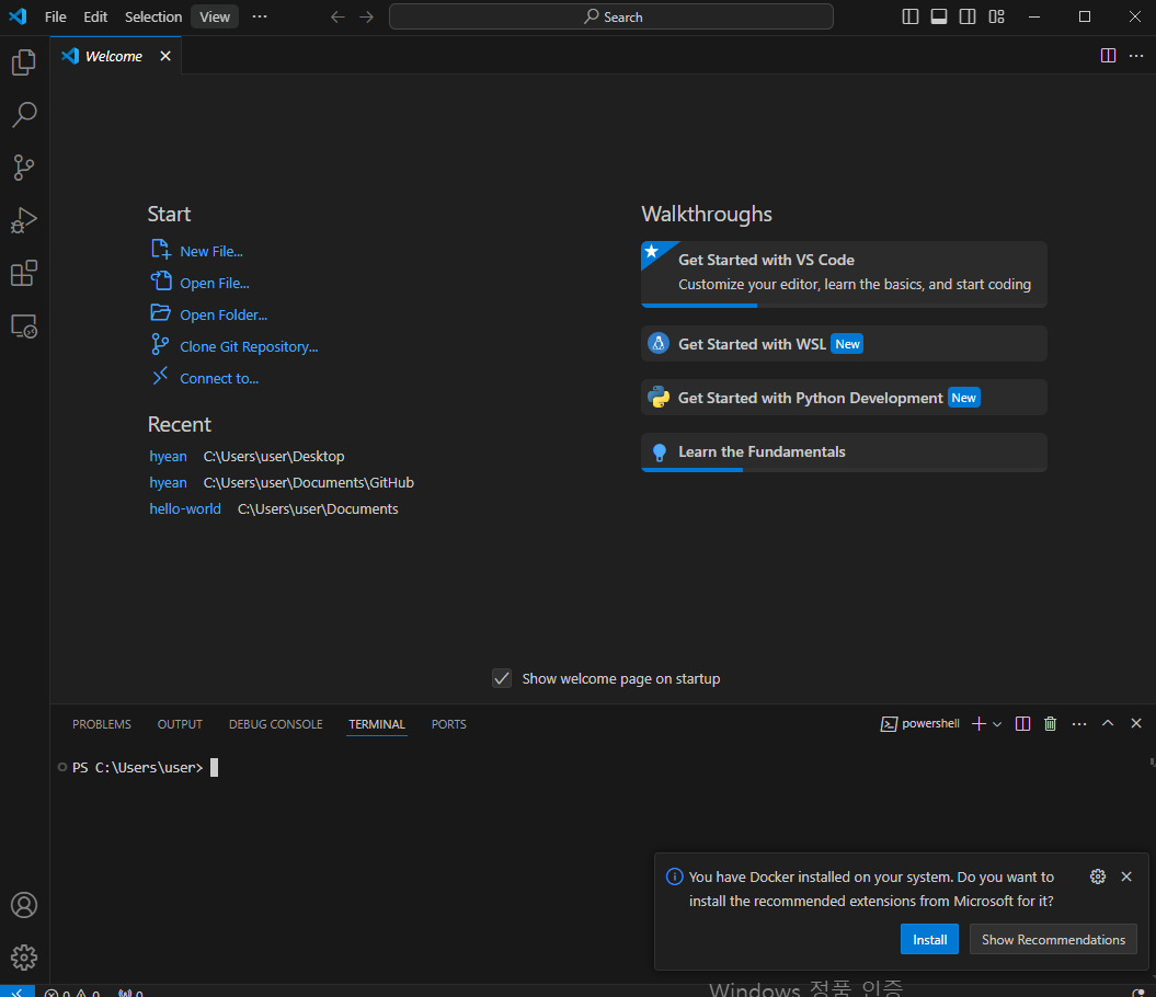 VS코드에는 터미널이 내장되어 있기 때문에 VS설치 후 별도 외부 터미널 및 파워쉘을 사용하 일이 거의 없다.