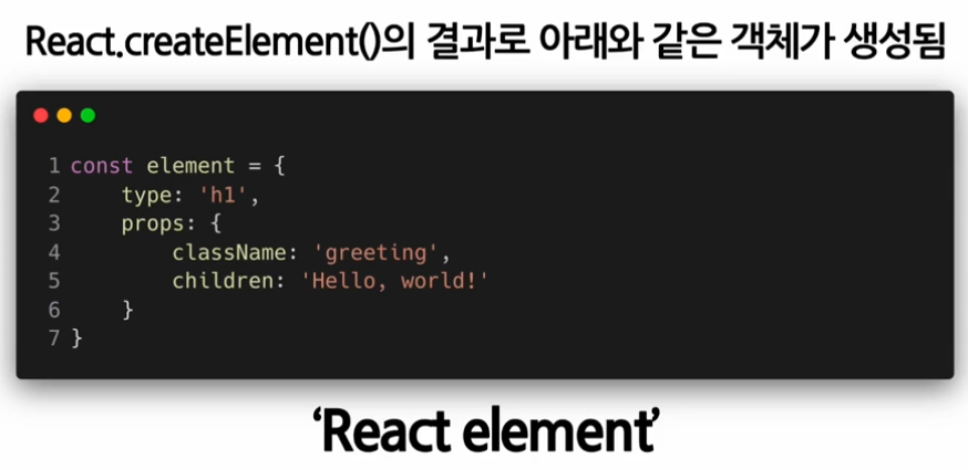 # hello라는 이름을 가진 React 컴포넌트가 나오고 컴포넌트 내부에서 JavaScript 코드와 HTML 코드가 결합된 JSX를 사용