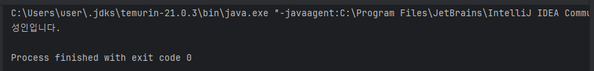 System.out.println("성인입니다."); // 조건이 참일 때