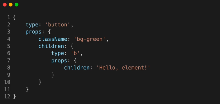 # 위 자바스크립트 코드는 React 컴포넌트 엘리먼트를 나타낸 코드로 일반적인 자바스크립트 객체다.