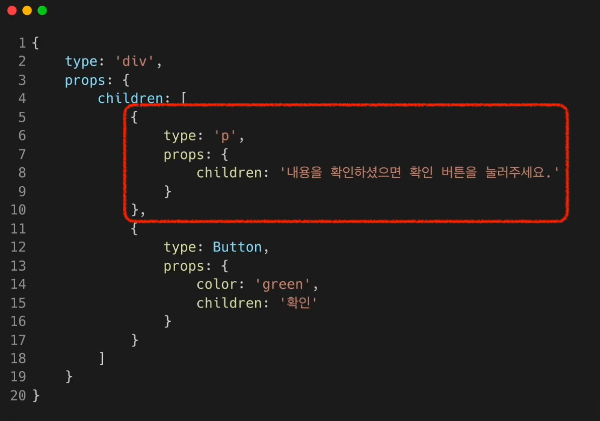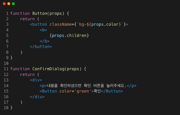 # 두 번재 칠드런의 타입은 HTML 태그가 아닌 React 컴포넌트의 이름인 버튼이다.